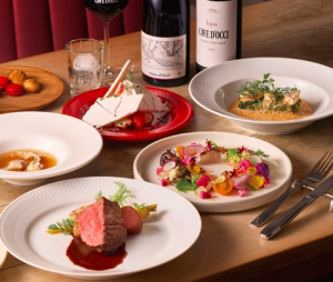 メインに魚料理と肉料理。クリスマス限定デザートが付いた8品のビストロコース。