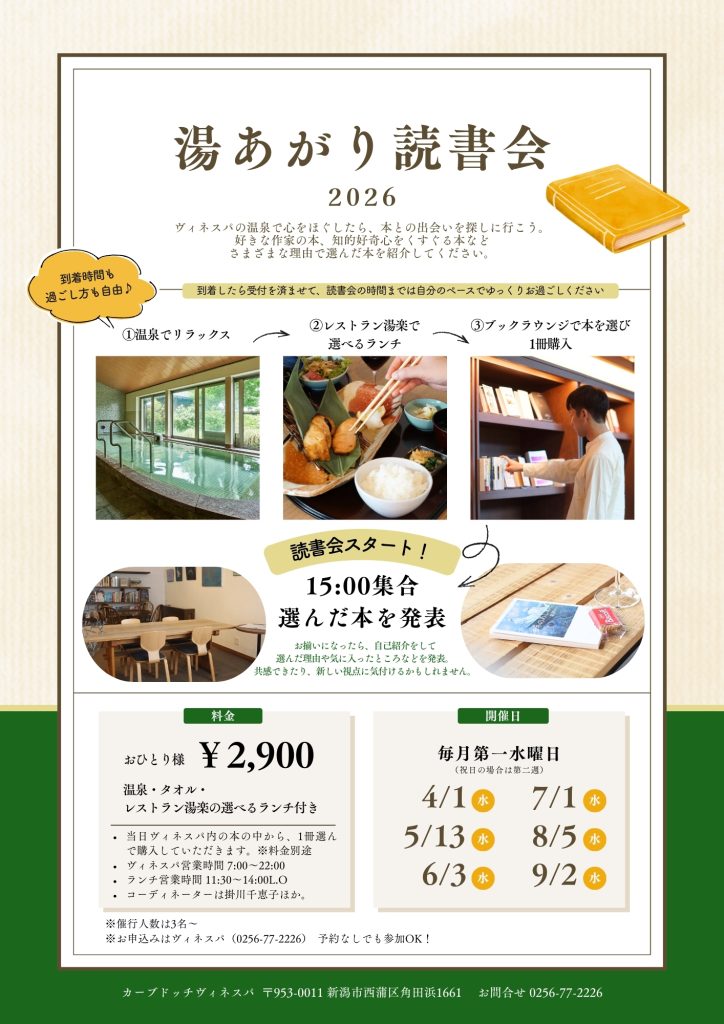 ヴィネスパで本と温泉を楽しむ「湯あがり読書会」を開催します。